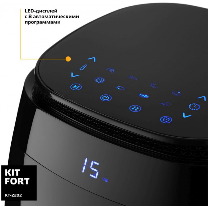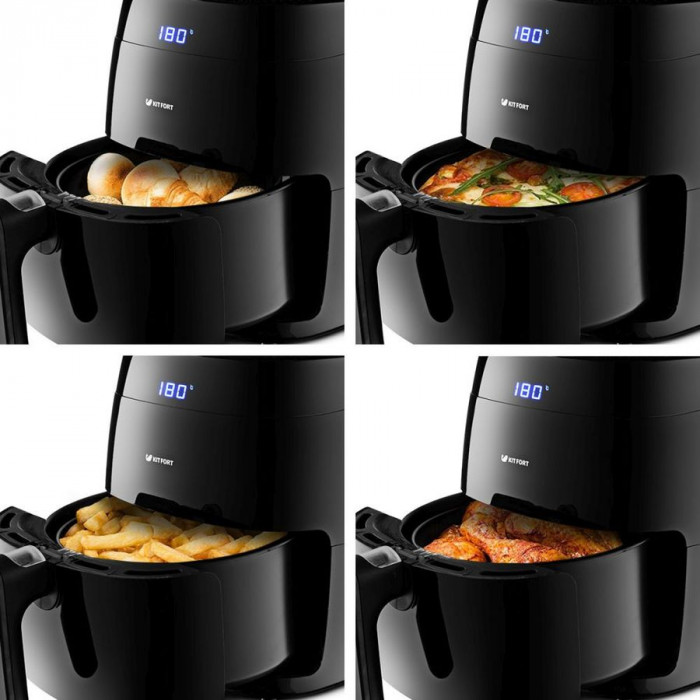 Температура аэрогриля KITFORT КТ-2202 варьируется от 80 до 200 градусов, которая достигает своего максимума за три минуты. Подобрать нужный режим можно при помощи простого электронного управления со встроенным дисплеем. Устройство укомплектовано поддоном и специальной корзиной для наиболее комфортной эксплуатации.